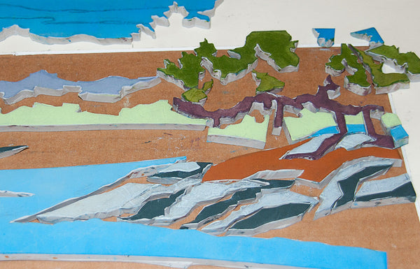 A jigsaw reduction woodblock print of a New England beach by artist Hannah Phelps